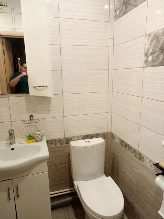Квартира с современным ремонтом, светлая и просторная. В квартире совмещенный санузел, оформленный в светлых тонах.